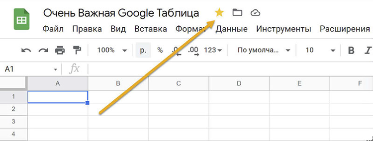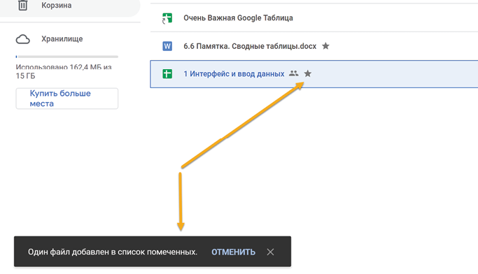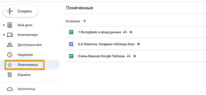 В редакторах (Таблицы, Документы, Презентации) можно отправить файл в «Помеченные» непосредственно во время работы — звездочка справа от названия файла (если она закрашена, значит, документ уже в «Помеченных»):
