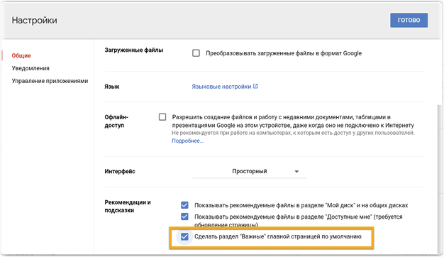 «Важные» можно сделать стартовой страницей вашего Google Диска. Для этого зайдите в настройки Диска. В конце раздела «Общие» выберите «Сделать раздел “Важные” главной страницей по умолчанию» (Make priority my default homepage).