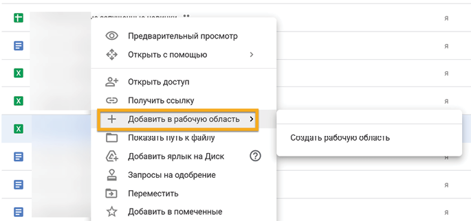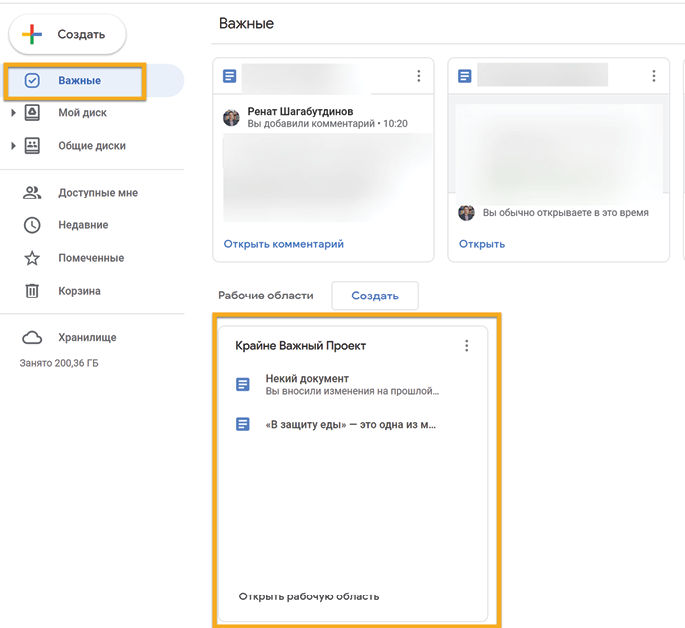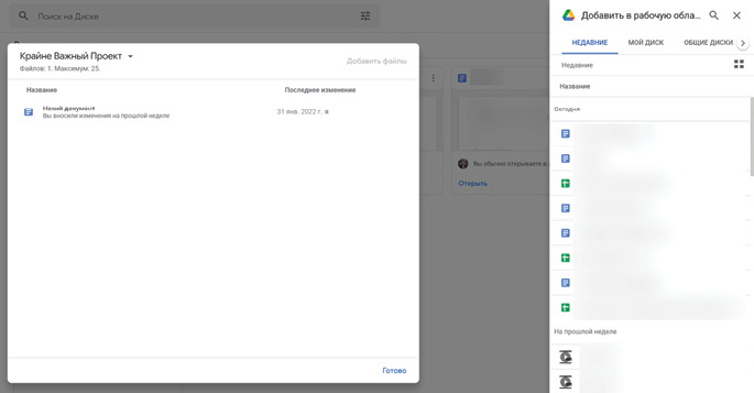 Рабочие области также доступны только в Google Workspace. В рабочую область можно «сложить» до 25 файлов. При этом их расположение не поменяется, файлы останутся в тех же папках, в которых и находились, но будут доступны в одном месте.