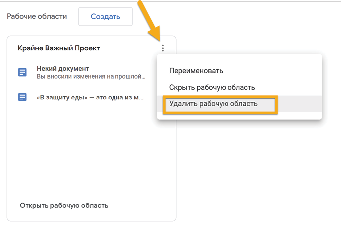 Для удаления рабочей области нажмите на три точки в правом верхнем углу и выберите «Удалить рабочую область» / Remove workspace: