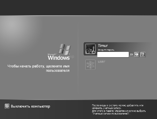 Windows XP может работать в одно– или многопользовательском режимах. В первом все пользователи работают с одинаковыми настройками и режимами, а во втором настройки системы различны для каждого пользователя. В многопользовательском режиме при загрузке системы на мониторе отображается экран приветствия (рис. 1.2).