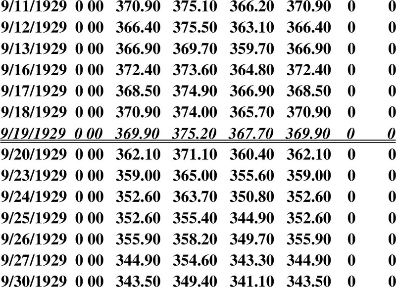 Мировая экономика находилась в неплохом состоянии – прошло 10 лет после первой мировой войны, страны казалось бы хорошо развивались, но кризис назревал. Обычно приводят некие социальные причины, политические расклады и т. д. Я показываю только факты. Перед вами таблица биржевого индекса Доу Джонс. Сентябрь 1929 г. Показатели торгов в Нью-Йорке за все 20 дней месяца. 19 сентября 1929 г. произошло незаметное событие – сменился тренд торгов и индекс надолго пошел вниз. Он начал свое движение медленно, но безостановочно. 18 октября 1929 г. рынок начал свободно падать.