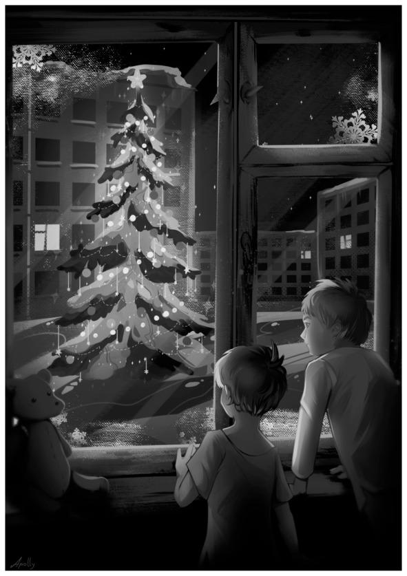 В этот миг на ёлке засверкали невесть откуда взявшиеся гирлянды, на макушке дерева ярко засияла рубиновая звезда. Дети прекратили кататься и обступили ель, восхищённо глядя на неё.