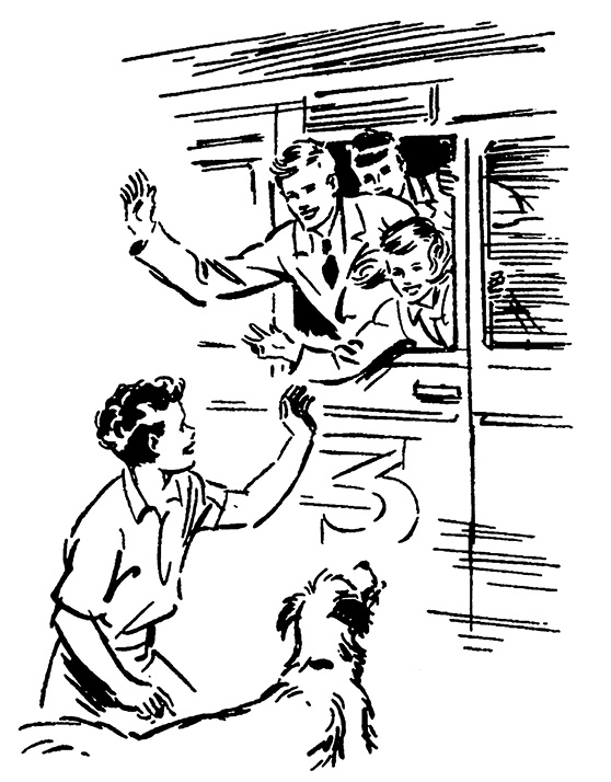 Вскоре послышалось отдалённое «чух-чух», а затем короткий свисток. Поезд медленно втягивался на станцию. Тим от нетерпения даже слегка задрожал. Путешествовать он не любил, но встречать пассажиров было для него величайшим удовольствием. Вот он наконец увидел троих ребят, двух мальчиков и одну девочку, все дружно махали им из окна, и он ещё энергичнее завилял хвостом, надеясь, что хозяйка последует его примеру. И Джордж не замедлила. Правда, от природы хвоста она не имела, зато умела радостно улыбаться.