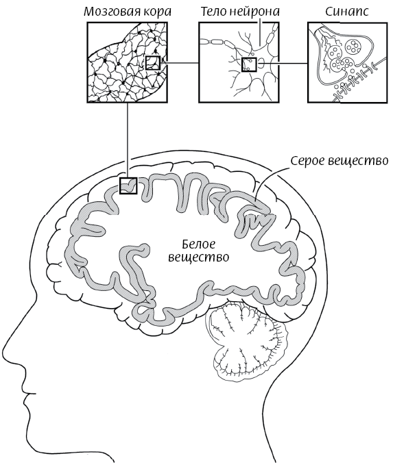 Мозг состоит из серого и белого вещества. В сером веществе (на самом деле оно не серое, а розовое) находятся тела нейронов и синапсы. Там происходит передача импульсов между нейронами. Белое вещество — это проводящие пути, длинные волокна, по которым идут нервные импульсы, напоминая ток электричества в проводах. Как и электрическим проводам, нейронным волокнам требуется изоляция. Благодаря изоляционному материалу импульсы в мозге передаются быстрее. Этот материал называется миелином и содержит много жиров, поэтому и выглядит белым. Серое вещество находится в коре больших полушарий, коре мозжечка, а также в глубинных структурах головного мозга — так называемых ядрах.