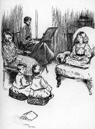 A pretty, cheerful nursery—a nursery in which surely children could not but be happy—with pictures on the walls and toys in the glass-doored cupboard, and rocking-horse and doll-house, and everything a child's heart could wish for. Spring sunshine faint but clear, like the first pale primrose, peeping in at the window, a merry fire crackling away in the tidy hearth. And just in front of it, for it is early spring only, a group of children pleasant to see. A soft-haired, quiet-eyed little girl, a book open upon her knee, and at each side, nestling in beside her, a cherub-faced dot of a boy, listening to the story she was reading aloud.