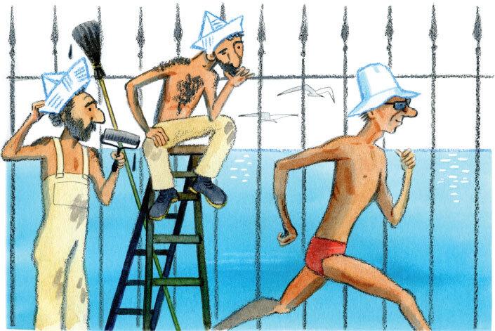 – Здравствуйте, товарищи, – отвечает им папа и скорей, пока жители города не повысыпали из домов, мчится дальше, на море – в этих своих, как я уже говорила, плавках.