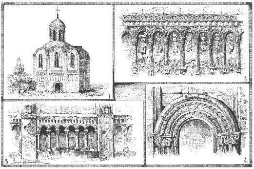 1. Дмитровский собор XII в., построенный великим князем Всеволодом Георгиевичем в 1194 г. и реставрированный в царствование императора Александра II. 2, 3, 4. Архитектурные украшения владимирских и суздальских храмов