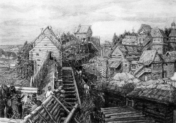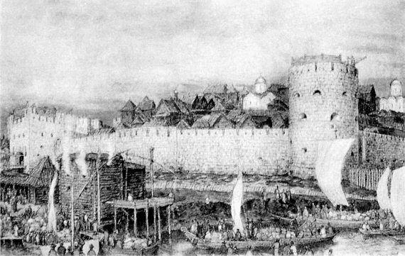 Известно, что в Древней Руси даже каждый монастырь был обнесен хотя бы деревянной стеной. Сначала, без сомнения, и Москва была обнесена тыном. Но уже в 1156 г. вел кн. Юрий Долгорукий закладывает Москву – град на устье реки Неглинной, выше реки Яузы. Град, город в древнем смысле, означает стены, следовательно, первые московские городские стены были построены в 1156 г. Первый значительно разбогатевший московский вотчинник, Иван Данилович Калита12, рубит на месте погоревшей новую дубовую стену города (1339), остатки которой, толстые дубовые бревна, при последних перестройках кремлевских зданий были найдены в земле со стороны Неглинной. Внук Калиты, еще более разбогатевший и усилившийся, закладывает стену из белого камня (1367). Но богатство, сила и хозяйство растет, ширится, привлекает население. У стены возникают торговые и ремесленные слободы, возникает целый посад на берегу реки, пониже княжеского двора, ибо торговая дорога идет снизу судоходством по реке. Между тем через сто лет каменные стены уже обветшали, и сама черта города для раздобревшей жизни стала тесноватой. Великий князь Иван Васильевич строит новый город, т. е. собственно стены, и строит не на прежней основе, а с прибавкой, т. е. расширяет место и, сверх того, укрепляет город бойницами, стрельницами, тайниками, башнями. Такие постройки очень ясно выразили, что сила московского вотчинника стала не только крепкой, но и грозной. Он и сам называется уже Грозным.