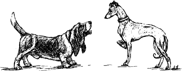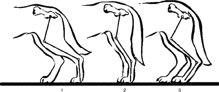 Задние конечности, как я уже сказал, обеспечивают мощный толчок вперед, который передается телу через крестец и поясничный отдел позвоночника. Задние конечности довольно жестко соединены с осевым скелетом посредством тазобедренных суставов. У пород, предназначенных для бега галопом, бедро, как правило, относительно длиннее, а круп в той или иной степени покатый, «свислый», так что колено оказывается ниже уровня локтя. У собак, для которых главный аллюр – неутомимая рысь, бедро сравнительно короче и находится приблизительно на уровне локтя. Голень длинная у тех и других, короткая голень – признак «небыстроходности».