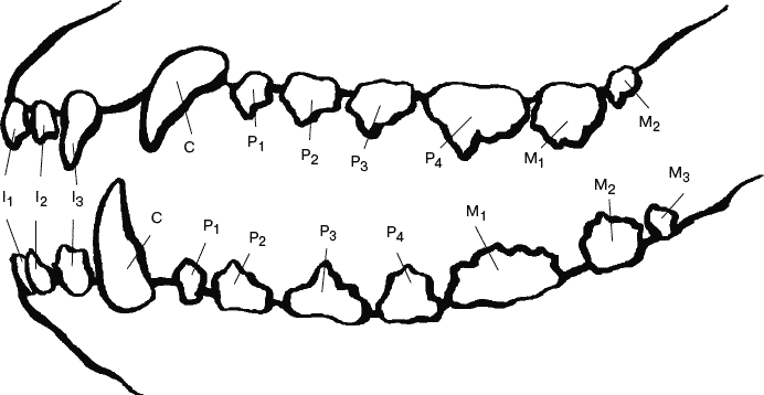 Зубы собаки: I – резцы; C – клыки; P – премоляры (предкоренные); M – моляры (коренные)