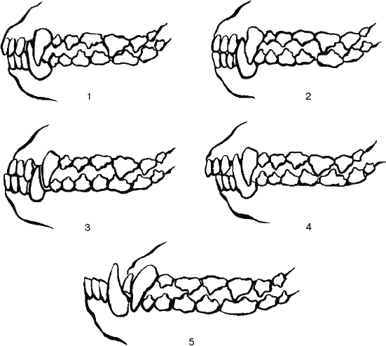 Форма прикуса собаки: 1 – нормальный (ножницеобразный); 2 – прямой (клещеобразный); 3 – перекус; 4 – недокус; 5 – бульдожий