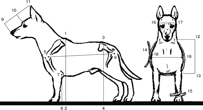 Промеры собаки: 1–2 – высота в холке; 3–4 – высота в крестце; 5–6 – косая длина туловища; 7–8 – длина передней ноги; 9–10 – длина морды; 10–11 – длина лба; 9–11 – длина головы; 12–13 – глубина груди; 14 – обхват груди; 15 – обхват пясти; 16–17 ширина головы в скулах; 18–19 – ширина груди спереди