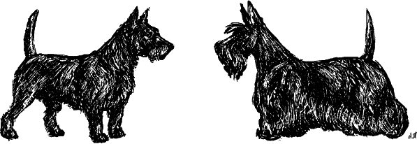 Хотя шотландские, в общем смысле этого слова, терьеры изначально не были специально охотничьими собаками, однако на зверовой охоте они использовались регулярно. Правда, уже не одно столетие самые крупные звери Шотландии – это барсук и лиса. Но для небольшой собаки и барсук весьма грозный противник. Да и лиса, особенно загнанная в угол, способна задать псу нешуточную трепку. Так что в собаках культивировались смелость и упрямство, и так присутствовавшие в шотландских терьерах в достаточном количестве. Природная коротконогость шотландских дворняжек при этом поощрялась. Шотландия – горная страна. От собаки здесь не требовалась большая скорость, а работать в норах, щелях и каменных завалах псу с короткими лапами проще. Но уже в середине XIX столетия необычная внешность скотча привлекла внимание широкой публики. И именно тогда скотч стал официальной породой, был разработан его первый стандарт, и гордый горец начал карьеру комнатной собачки. За прошедшие полтора века в этой роли скотч многое утерял. Прежде всего, очень сильно снизились его физические возможности. Утрирование исконных черт экстерьера привело, в первую очередь, к увеличению массивности костяка и смещению центра тяжести вперед, и нынешнему шотландцу далеко в скорости, выносливости и поворотливости до своих предков. Скотч обзавелся совершенно не свойственной ему в старину «юбкой», а требование не очень умных эстетов выставлять скотча исключительно выщипанным привело к резкому ухудшению качества шерсти как защитного покрова. Еще лет сорок назад велись споры, правильно ли выставлять скотча с «подчищенной» шерстью, сейчас же альтернативы нет, вас просто не выпустят на ринг с лохматой собакой. Очень многое утерял скотч и в характере. Мужества, упрямства и сообразительности от него давно не требуется, а воинственность и независимость прямо искореняются, поскольку одно из главных требований к любимцу – не создавать проблем любителю. К счастью, крутую шотландскую закваску скотча пока еще не удалось вытравить окончательно. Но тенденция очевидна и печальна.