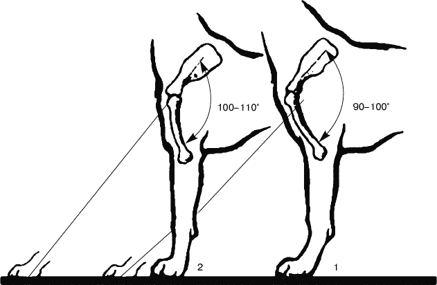 Для правильной работы передних конечностей очень важное значение имеют углы, под которыми соединяются кости. Угол между лопаткой и плечевой костью в норме составляет около 95° или чуть больше, в этом случае плечо называется косым нормальным. Это волчья форма плеча. При таком плече угол между плечом и предплечьем (локтевой угол) составляет около 125°. При прямом плече угол между лопаткой и плечом и, соответственно, локтевой угол больше. Такими углы у собаки с нормальным косым плечом становятся, когда она вытягивается на передних ногах, приподнимая переднюю часть тела. При прямом плече шаг укорочен, собака не может идти размашистой рысью, но на галопе или, особенно, карьере[3] такое плечо выгодно, оно увеличивает устойчивость и маневренность. Прямое плечо характерно, например, для борзых, эрделей, боксеров, доберманов. При остром плече угол между лопаткой и плечевой костью меньше 80°, но локтевой угол обычно остается нормальным. В результате собака как бы слегка наклонена вперед на выпрямленных передних ногах. Для некоторых пород, например, для колли, острое плечо является нормой, но в большинстве случаев так держат передние конечности старые, больные или ослабленные собаки.