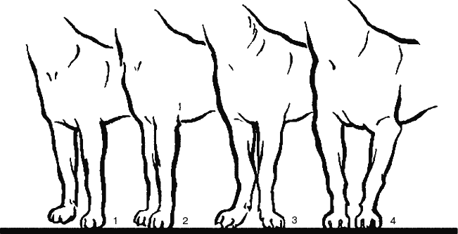 Постав передних конечностей: 1 – правильный постав; 2 – узкий постав; 3 – размёт; 4 – косолапость