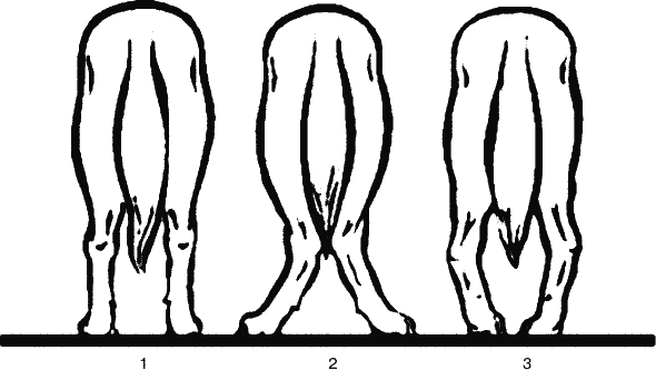 Постав задних конечностей (вид сзади): 1 – правильный постав; 2 – сближенность скакательных суставов; 3 – бочкообразный постав