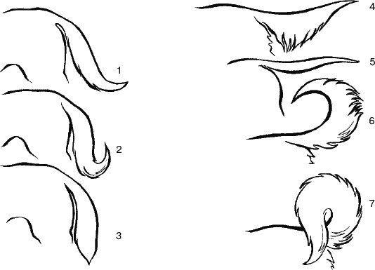 Формы хвоста собаки: 1 – саблевидный; 2 – крючком; 3 – поленом; 4 – пером; 5 – прутом; 6 – серпом; 7 – кольцом