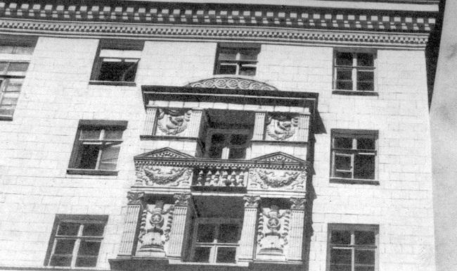 Я остановлюсь на трех примерах из этой же области, которые говорят не только о фасадничестве, но и о качестве проектирования. Проект жилого дома автодорожников по Ленинградскому шоссе, 92–96 (ныне дом номер 60 по Ленинградскому проспекту. – А. Р.) разработан с необычайной пышностью и внешним убранством арх. Ефимовичем. Фотография проекта этого дома говорит за себя.