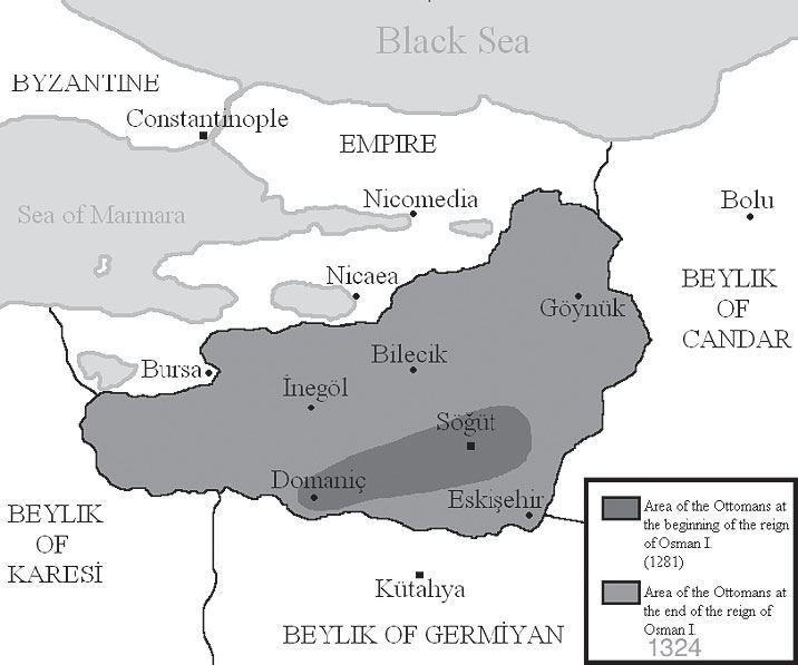 Бейлик, который вождь огузского племени кайи Эртогрул передал своему сыну Осману, располагался на западе Малой Азии, далеко от монгольских властей и на границе с византийскими землями. Удаление от монголов давало самостоятельность, пускай ее и приходилось выкупать ежегодной данью, а близость к Византии предоставляла возможность расширяться за счет завоевания земель неверных. Осман был приверженцем ислама и весьма успешно использовал идею джихада[23], за что и получил титул Гази[24].