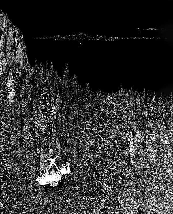 Нет такой мельчайшей подробности в зодчестве и убранстве того брачного покоя, что ныне не представала бы зримо предо мною. Где были души надменных родичей невесты, когда, снедаемые жаждою золота, они позволили деве, дочери, столь любимой, переступить порог покоя, убранного таким образом? Я сказал, что в точности помню любую мелочь покоя – но плачевно запамятовал многое, более важное; а в фантастическом обличии покоя не было никакой системы, никакого порядка, ничего, способного удержаться в памяти. Комната помещалась в высокой башне аббатства, построенного на манер замка, была просторна и о пяти углах. Всю южную сторону пятиугольника занимало единственное окно – огромный кусок цельного стекла из Венеции – свинцового оттенка, так что лучи солнца или луны, проходя сквозь него, падали на все с жутким отсветом. Над верхнею частью этого громадного окна простиралась решетка, увитая старой лозой, что карабкалась вверх по массивным стенам башни. Потолок из мрачного дуба, сводчатый и чрезвычайно высокий, испещряла резьба: очень странный, гротескный орнамент – полуготический, полудруидический. Из самой середины этих унылых сводов, на одной золотой цепи с длинными звеньями, свисал огромный светильник из того же металла, сарацинский по рисунку; и многочисленные отверстия в нем были пробиты с таким расчетом, дабы из них, извиваясь, как бы наделенные змеиной гибкостью, непрерывно выскальзывали многоцветные огни.