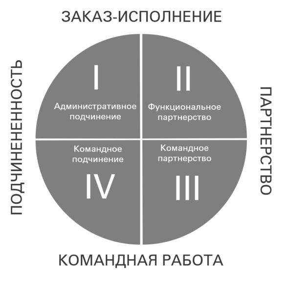 Таким образом, отношения с партнерами по взаимодействию могут характеризоваться одной из четырех базовых рамок: административного подчинения (I), функционального партнерства (II), командного партнерства (III), командного подчинения (IV).