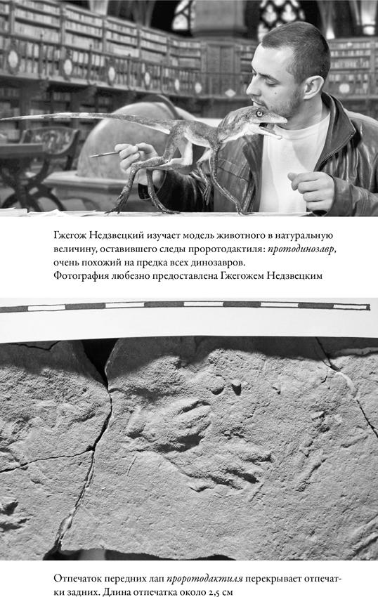 Обладатель найденных здесь следов — праотец динозавров — по-научному называется проротодактиль (Prorotodactylus). Гжегож не был уверен, что это он. Эти следы явно отличались от других, найденных рядом, и всех следов из перми. Но какое животное их оставило? У Гжегожа было предчувствие, что они могут иметь какое-то отношение к динозаврам, потому что пожилой палеонтолог по имени Хартмут Хаубольд сообщал о подобных следах из Германии в 1960-х гг. и приписывал их ранним динозаврам или их близким родственникам. Но Гжегожа эта гипотеза не убеждала. В начале карьеры он по большей части изучал следы, а не реальные скелеты динозавров, так что ему было трудно соотнести следы с животными, которые их могли оставить. Тут и пригодился я. Для своей магистерской диссертации я построил родословную триасовых рептилий, показывающую, как первые динозавры были связаны с другими животными того времени. Я провел месяцы в музейных коллекциях, изучая ископаемые кости, и потому хорошо знал анатомию первых динозавров. Как и Ричард, который написал кандидатскую по их эволюции. Мы собрались втроем, чтобы выяснить, кто же оставил следы проротодактиля, и действительно пришли к выводу, что это было животное, очень похожее на динозавров. Мы опубликовали нашу гипотезу в научной статье в 2010 г.