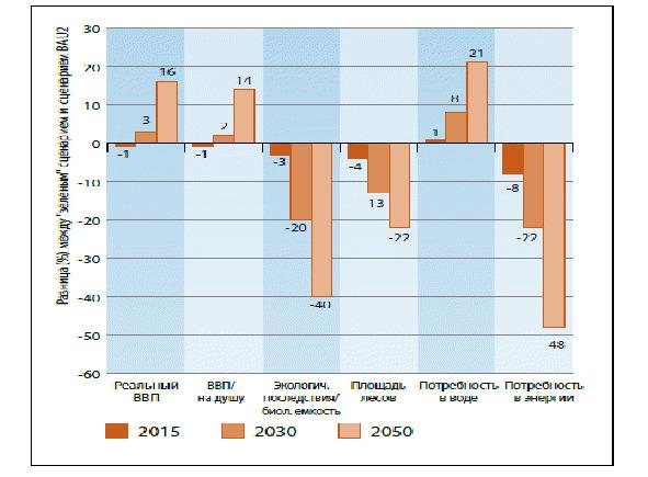 Даже если не учитывать потенциальное негативное воздействие изменения климата или утраты многих экосистемных услуг, мировой экономический рост в сценарии обычного развития будет, тем не менее, сдерживаться растущим дефицитом энергетических и природных ресурсов. Даже при весьма консервативных допущениях сценарий «зеленых» инвестиций позволяет добиться более высоких годовых темпов роста в течение 5—10 лет и увеличивает запасы возобновляемых ресурсов, необходимых для развития мировой экономики. Способствуя росту инвестиций в ключевые экосистемные услуги и развитие с низким уровнем выбросов углерода, подобный экономический рост в меньшей степени сдерживается собственным воздействием на окружающую среду, что подтверждается существенным уменьшением экологических последствий в глобальном масштабе.
