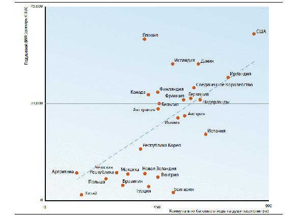 Рисунок 1.4. Зависимость между ВВП на душу населения и количеством твердых городских отходов на душу населения [123].