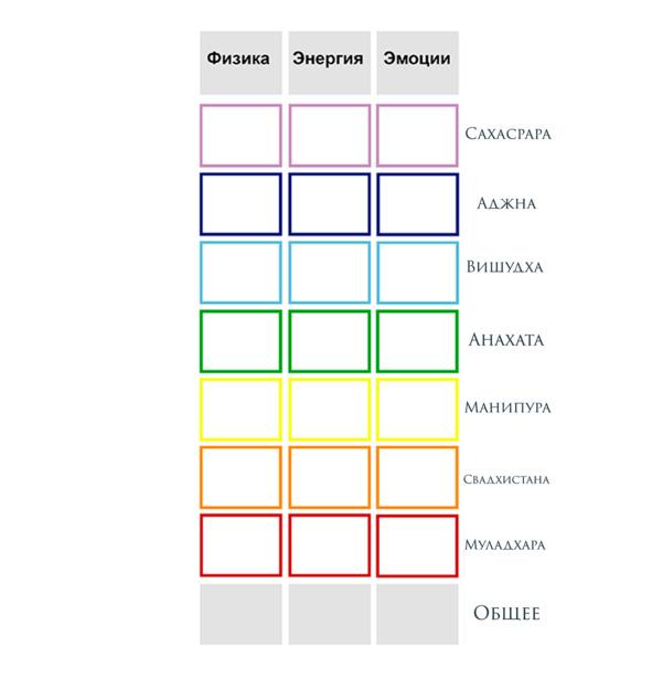 В одном столбце должно быть восемь ячеек. Семь ячеек чакровые, а восьмая — общий знаменатель.