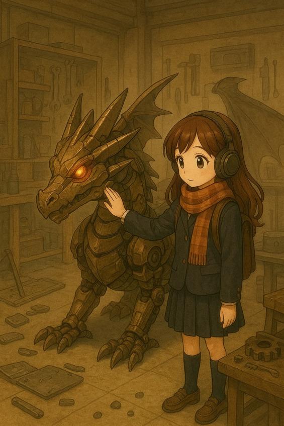 Посреди комнаты стояло нечто, что сразу привлекло внимание Индиры. Это был небольшой железный дракон, ростом с велосипед. Его металлические чешуйки блестели в свете ламп, а внутренняя структура была видна сквозь открытые панели: пружины, моторы, гидравлические трубы и электроника. Глаза дракона представляли собой две небольшие лампочки, которые в этот момент были потушены.