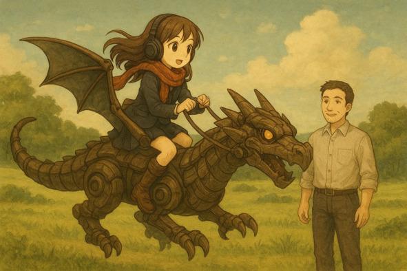 Мама и папа стояли во дворе и с удовольствием наблюдали, как их дочь и её механический дракон кружат над городом. Жители, увидев невероятное зрелище, останавливались и показывали друг другу на небо. Восторг зевак был несравненным: дети махали руками, взрослые снимали происходящее на телефоны, а кто-то даже пытался позвонить друзьям, чтобы те тоже успели увидеть это чудо.