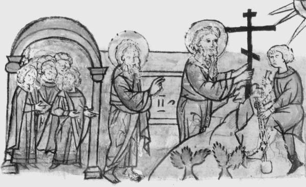 Приход апостола Андрея с учениками к месту основания Киева; благословение Андреем этого места и воздвижение креста на высоком берегу Днепра. Миниатюра из Радзивилловской летописи