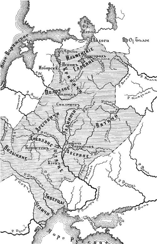 Многие Славяне, единоплеменные с Ляхами, обитавшими на берегах Вислы, поселились на Днепре в Киевской губернии и назвались Полянами от чистых полей своих. Имя сие исчезло в древней России, но сделалось общим именем Ляхов, основателей Государства Польского. От сего же племени Славян были два брата, Радим и Вятко, главами Радимичей и Вятичей: первый избрал себе жилище на берегах Сожа, в Могилевской Губернии, а второй на Оке, в Калужской, Тульской или Орловской. Древляне, названные так от лесной земли своей, обитали в Волынской Губернии; Дулебы и Бужане по реке Бугу, впадающему в Вислу; Лутичи и Тивирцы по Днестру до самого моря и Дуная, уже имея города в земле своей; Белые Хорваты в окрестностях гор Карпатских; Северяне, соседи Полян, на берегах Десны, Семи и Сулы, в Черниговской и Полтавской Губернии; в Минской и Витебской, между Припятью и Двиною Западною, Дреговичи; в Витебской, Псковской, Тверской и Смоленской, в верховьях Двины, Днепра и Волги, Кривичи; а на Двине, где впадает в нее река Полота, единоплеменные с ними Полочане; на берегах же озера Ильменя собственно так называемые Славяне, которые после Рождества Христова основали Новгород.