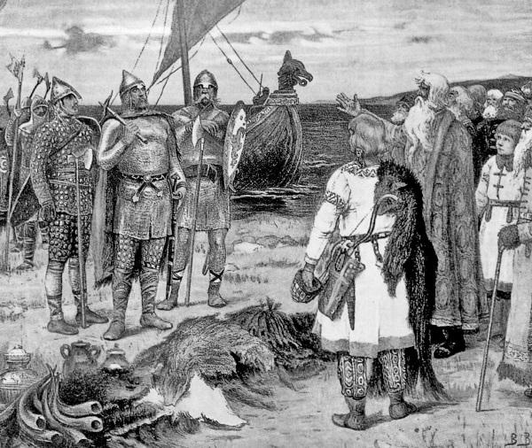 Новгородцы и Кривичи были тогда, кажется, союзниками Финских племен, вместе с ними плативших дань Варягам: имев несколько лет одну долю, и повинуясь законам одного народа, они тем скорее могли утвердить дружественную связь между собою. Нестор пишет, что Славяне Новогородские, Кривичи, Весь и Чудь отправили Посольство за море, к Варягам-Руси, сказать им: Земля наша велика и обильна, а порядка в ней нет: идите княжить и владеть нами. Слова простые, краткие и сильные! Братья, именем Рюрик, Синеус и Трувор, знаменитые или родом или делами, согласились принять власть над людьми, которые, умев сражаться за вольность, не умели ею пользоваться. Окруженные многочисленною Скандинавскою дружиною, готовою утвердить мечем права избранных Государей, сии честолюбивые братья навсегда оставили отечество. Рюрик прибыл в Новгород, Синеус на Белоозеро в область Финского народа Веси, а Трувор в Изборск, город Кривичей. Смоленск, населенный также Кривичами, и самый Полоцк оставались еще независимыми и не имели участия в призвании Варягов. Следственно, держава трех владетелей, соединенных узами родства и взаимной пользы, от Белаозера простиралась только до Эстонии и Ключей Славянских, где видим остатки древнего Изборска. Сия часть нынешней С. Петербургской, Эстляндской, новогородской и Псковской Губерний была названа тогда Русью, но имени Князей Варяго-Русских. Более не знаем никаких достоверных подробностей; не знаем, благословил ли народ перемену своих гражданских уставов? Насладился ли счастливою тишиною, редко известною в обществах народных? Или пожалел ли о древней вольности? Хотя новейшие Летописцы говорят, что Славяне скоро вознегодовали на рабство и какой-то Вадим, именуемый Храбрым, пал от руки сильного Рюрика вместе со многими из своих единомышленников в Новегороде – случай вероятный: люди, привыкшие к вольности, от ужасов безначалия могли пожелать Властителей, но могли и раскаяться, ежели Варяги, единоземцы и друзья Рюриковы, утесняли их – однако ж сие известие, не будучи основано на древних сказаниях Нестора, кажется одною догадкою и вымыслом.
