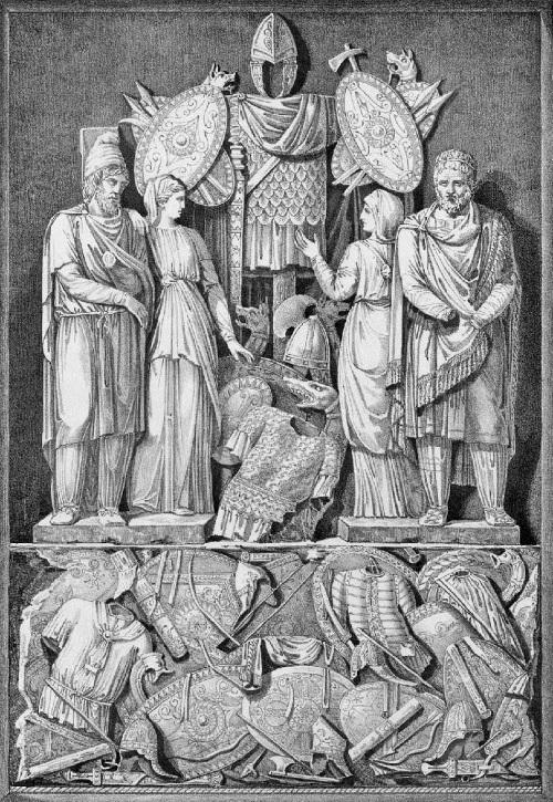 В третьем веке приближились от Балтийского к Черному морю готфы и другие народы германские, овладели Дакиею, римскою провинциею со времен Траяновых, и сделались самыми опасными врагами империи. Переплыв на судах в Азию, готфы обратили в пепел многие города цветущие в Вифинии, Галатии, Каппадокии и славный храм Дианы в Ефесе, а в Европе опустошили Фракию, Македонию и Грецию до Мореи. Они хотели, взяв Афины, истребить огнем все книги греческие, там найденные; но приняли совет одного умного единоземца, который сказал им: "Оставьте грекам книги, чтобы они, читая их, забывали военное искусство и тем легче были побеждаемы нами". Ужасные свирепостию и мужеством, готфы основали сильную Империю, которая разделялась на восточную и западную, и в IV столетии, при Царе их Эрманарихе, заключала в себе не малую часть России европейской, простираясь от Тавриды и Черного моря до Балтийского.