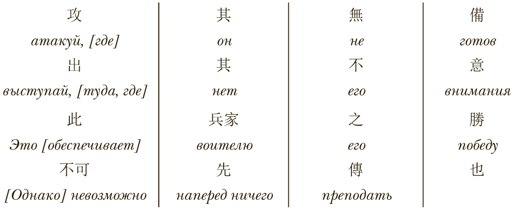 Фраза для наглядности переводится на русский язык буквально как «Война – это хитрости путь» (в тексте перевода читатель встретит вариант «Война – это путь хитрости»). Уже в одной этой фразе перед читателем встает половина всех означенных выше препятствий и трудностей.