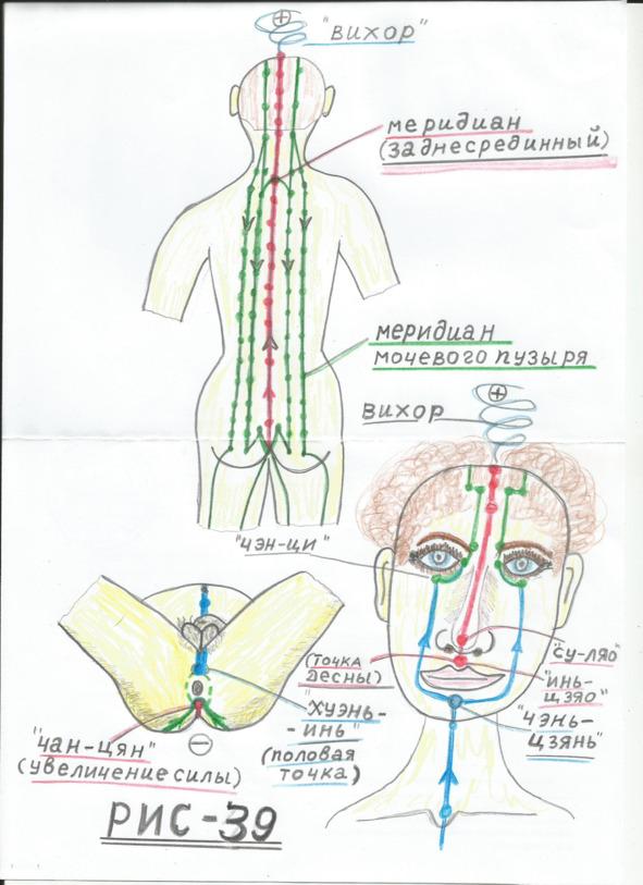 Р И С — 39. Энергетические каналы, связывающие группы точек акупунктуры. На Рис — 39, изображена схема энергетики половой системы человека. Как видно в области промежности изображены шунтирующие каналы главных меридианов половой системы (изображённых пунктирными линиями), в которых и происходит сбой энергетики, по причине «закупорки» этих каналов. Причина известна, слишком частые половые связи, без необходимости зачатия. Во всём животном мире, одной половой связи в год (весной), одной овуляции в год, достаточно для продолжения рода. У земных женщин овуляция происходит по Лунному циклу (ежемесячно), что ускоряет старение организма в 12 раз! Чтобы прочистить эти «пунктирные» каналы, можно использовать энергию Луны. Видимо не случайно, древние цивилизации назвали эту область тела — лоном (лунным). Лунным металлом является серебро! Вероятно, от того, что серебро часто использовали для изготовления зеркал, хорошо отражающих свет. В современной фотографии серебро используется в качестве фиксатора изображения на чёрно-белых фотоплёнках и на фотобумаге. В народной медицине серебро используется для рассасывания закупорок и флегмон и различных воспалений. Для прочистки «пунктирных» каналов лонного сочленения, древние народы, вероятно, применяли разнообразные «пояса верности». Когда супруг уходил на войну, он одевал на свою жену пояс верности из серебра или меди. Бедные дворяне, понятно применяли пояса «верности» из менее благородных металлов (обычно из железа). Понятно, что никакой пользы магнитное железо женщинам не приносило, а только укорачивало им жизнь и приводило к различным недомоганиям. Я проделал нехитрый опыт с железным прутком диаметром 8 мм, согнув его в виде подковы и, получил некое подобие «пояса верности» — замкнув им энергетические каналы промежности. Ночью, в 3 часа я внезапно проснулся от того, что вращение моих нижних «Чакр» застопорилось (остановилось). Ощущение неприятное и очень опасное. Сняв с пояса это металлическое приспособление, я тот час заснул. Вполне понятно, что князья и состоятельные дворяне, которые применяли пояса верности для своих жён из серебра, или меди, не могли не заметить, что их жёны после данной экзекуции хорошели. Но, только достаточно умные люди смогли, догадаться об истинной причине, оздоровления женщины (обычно, расцвет красоты воспринимался ревниво), как измена мужу. Понятно, что эту тайну (кто догадался) князья, старались сохранить и передавать своим потомкам. Тайна «пояса верности» была сохранена надёжно. Вполне понятно, что простые люди снабжали своих жён «поясами верности» изготовленных из магнитного железа (тогда женщины чахли), что воспринималось как тоска по мужу. Долго ли эта экзекуция продолжалась, пока кто-то не догадался, что магнитное железо являлось для женщин истинным источником страданий. То, что это было именно так, известно из древнего Рима. Римляне прекрасно знали, что ножные и ручные кандалы, настолько сильно снижают энергетику человека, что раб, закованный в кандалы, был не в состоянии совершить побег или оказать сопротивление. Серебряные «пояса верности», скорее всего, изготавливались крайне редко (из-за чернения металла), а вот медные и золотые нашли широкое применение в средние века и вероятно в глубокой древности, когда люди научились плавить металл. Серебро, мет