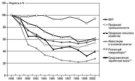 Рис. 1.1. Индексы основных социально-экономических показателей России за 1990–2000 гг.5