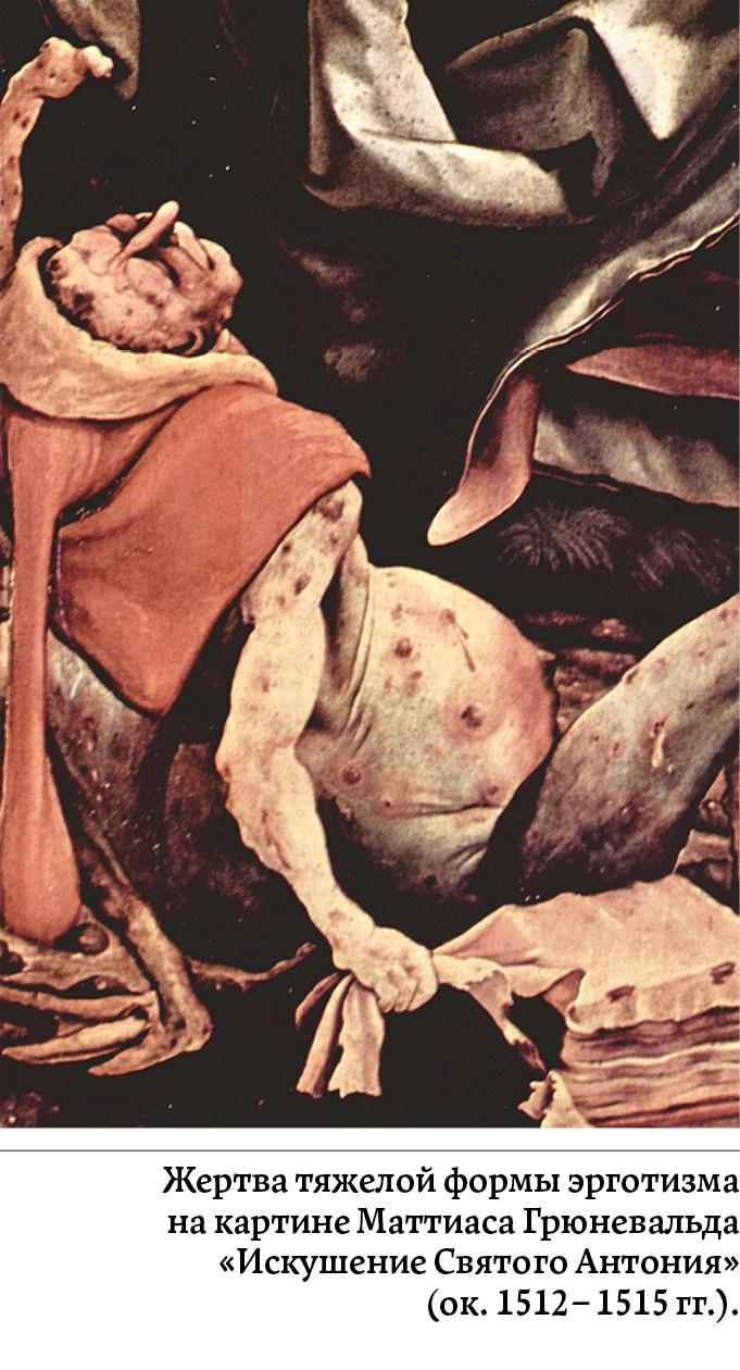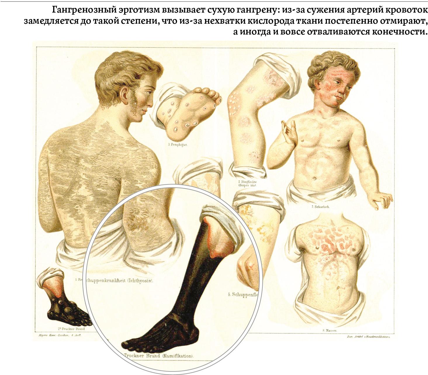 В наши дни отравление спорыньей — явление чрезвычайно необычное, а вот в Средневековье такие вспышки, к сожалению, возникали сплошь и рядом. Вот как описывает эпидемию гангренозного эрготизма в Германии IX века автор «Ксантенских анналов» [5]: «Великое мучение от гнойных пузырей распространилось среди людей и завершалось оно отвратительным гниением, так что перед смертью [телесные] члены отмирали и отваливались» [6].