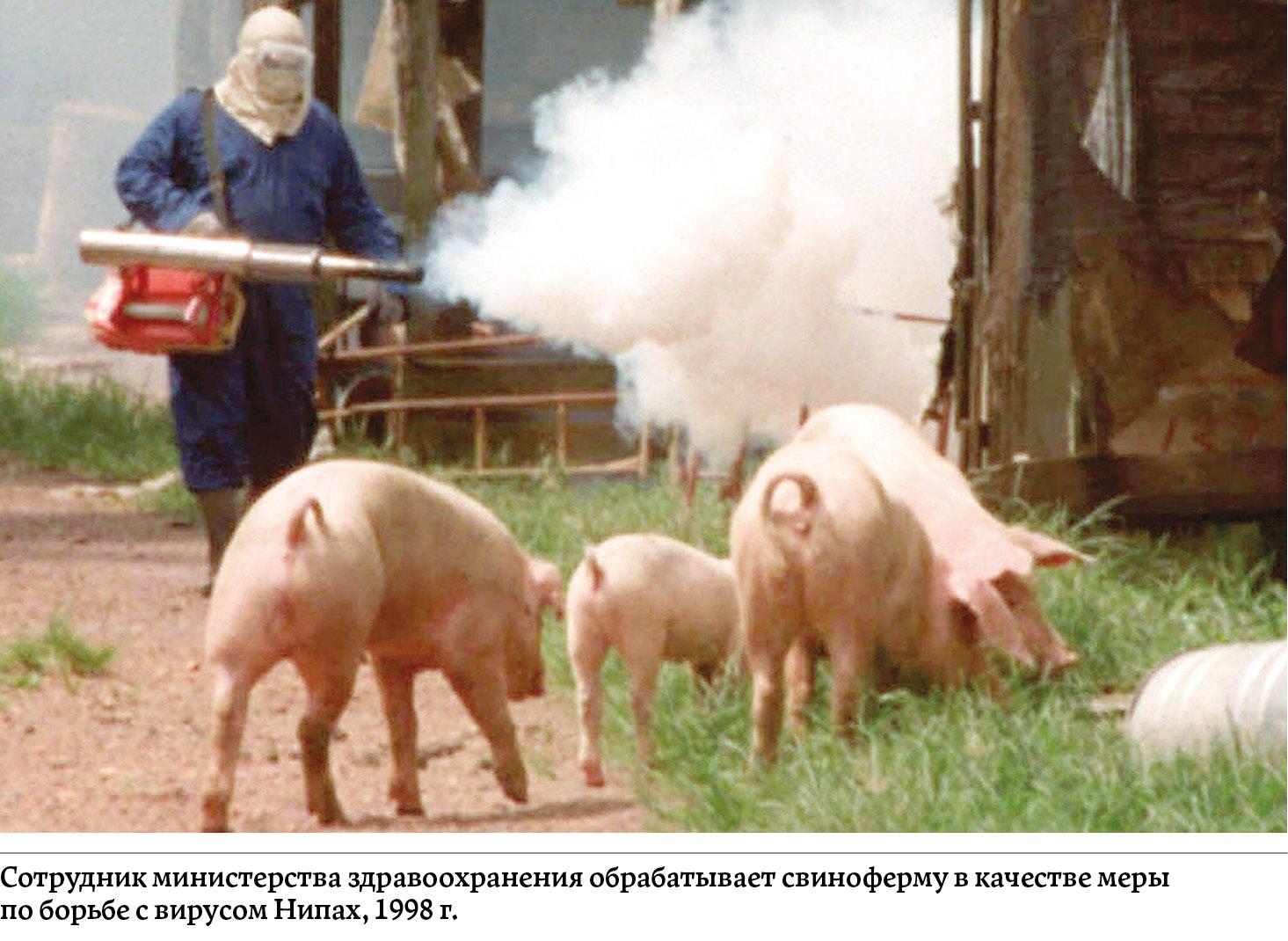 В сентябре 1998 года нескольким жителям Малайзии диагностировали воспаление головного мозга, или энцефалит. Если вы пораните палец на ноге и он загноится, вы без труда объясните врачу, что именно у вас болит, но энцефалит — совсем другое дело: он лишает больного всякой способности мыслить ясно. Сознание помрачается, а глаза слипаются от непреодолимой сонливости. Бушующая в мозге электрическая «буря» вносит сумятицу в работу синапсов, что приводит к судорогам. Организм пытается убить чужеродные патогены, повышая температуру, от чего пациента бросает в жар, а его разум еще больше затуманивается. Более 30% заразившихся той таинственной малайской инфекцией скончались (стоит отметить, что уровень смертности от сезонного гриппа, как правило, не превышает 0,1%).