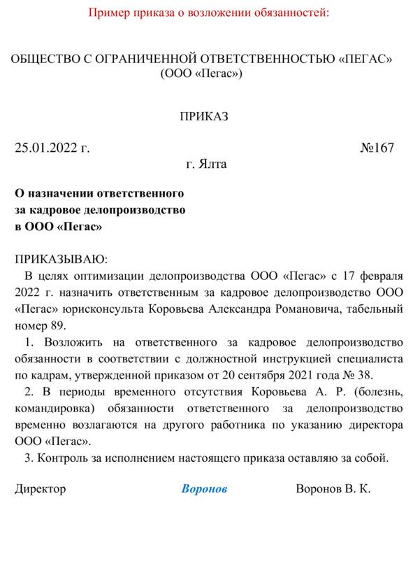 — сотрудник, в обязанность которого входит кадровое делопроизводство, что указано в его должностной инструкции (инспектор по кадрам, специалист по кадрам, менеджер по персоналу, делопроизводитель и т.п.);