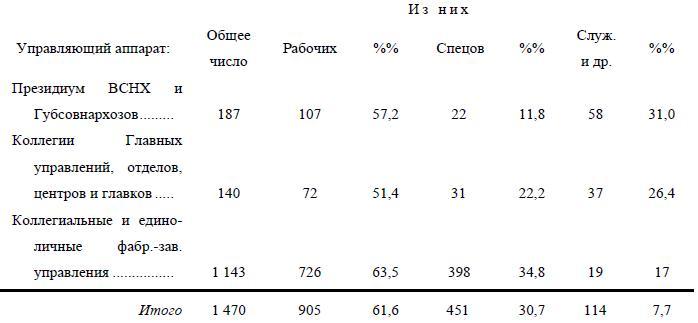 Тов. Милютин прислал мне несколько книг, в том числе «Отчет ВСНХ VIII Всероссийскому съезду Советов» (М., 1920; предисловие помечено 19 декабря 1920). На стр. 14-ой приведена здесь таблица, показывающая степень участия рабочих в управляющих органах. Привожу эту табличку (охватывающую только часть Губсовнархозов и предприятий):