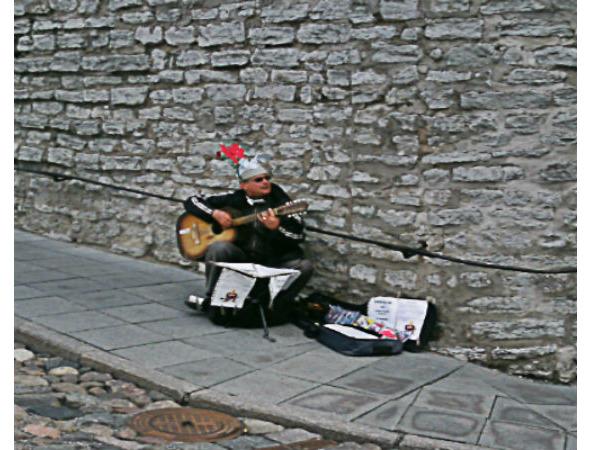 Каждый город на Земле хранит в себе особый шарм. Есть он и в Таллине. Этот мужчина с гитарой, нотами и шапкой-гребнем поёт на незнакомом языке одними губами. Со стороны это слышится набором звуков «Тр-бр-тра-бра-пурум-пум», но задор, с которым проделывается этот трюк, восхищает! Хочется останавливаться и слушать бесконечно.