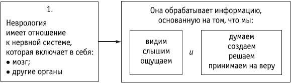 Элемент «нейро» в нейролингвистике относится к нервной системе. Значительная часть НЛП связана с пониманием и использованием принципов и паттернов нервной системы. Согласно НЛП, мышление, творчество, создание представлений и все остальные когнитивные процессы являются результатом выполнения нервной системой определенных программ. Человеческий опыт представляет собой комбинацию или синтез информации, которую мы получаем и обрабатываем с помощью нервной системы. На практике это связано с восприятием мира – с помощью зрения, осязания, слуха, обоняния и вкуса.