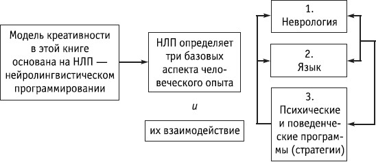 Модель креативности, которую нам предстоит исследовать, базируется на принципах и понятиях нейролингвистического программирования, которое появилось на свет в Калифорнии в начале 1970-х гг. В основе этой модели лежат исследования ряда основных аспектов человеческого существования. НЛП создали два человека, лингвист Джон Гриндер и математик Ричард Бэндлер (занимающийся также гештальт-терапией).