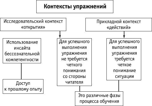 1. Исследовательская деятельность. Здесь читатели совершают работу с минимально определенными задачами с целью установления поведенческого референтного опыта, который послужит интуитивным обоснованием для когнитивных комплектов (о них будет рассказано позднее). Исследовательские упражнения обеспечивают читателю переживания спонтанные, незамутненные, свободные от сознательных ожиданий того, что предположительно может случиться. Исследовательские упражнения способствуют развитию бессознательной компетентности.