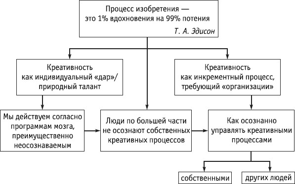 Томасу Эдисону приписывают следующую часто цитируемую фразу: «Изобретение – это процент вдохновения на 99 % потения». Смысл этого высказывания заключается в том, что самая креативная деятельность является, по сути, инкрементным (incremental) процессом, который обладает определенной структурой и требует организации и постоянных усилий для своего поддержания. Во многих отношениях, однако, креативность рассматривалась до сих пор скорее как нечто эфемерное, неуловимое – загадочный дар, который либо есть, либо отсутствует, – а отнюдь не как набор навыков, которым можно распоряжаться и управлять открыто и систематически.