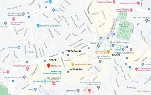 Выбрал некий «Irish Hotel» на северной стороне Истикляля, почти у бульвара Тарлабаши. Примерно за 50 баксов за комнату на одного. Что это реально по отношению к Таксиму и транспорту, было неясно по карте. Узнаем на месте (006).