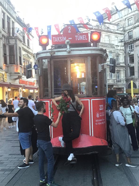 Вдруг появился знаменитый трамвай (012). Народ весело расступался, давая ему дорогу и фотографируя. У трамвая была остановка у самого конца Истикляль, у входа в Тюнель.